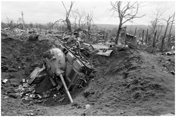 [Theo tài liệu tổng số xe thiết giáp đủ loại của cộng quân bị hạ tại An Lộc do các binh chủng Quân Lực VNCH bắn bằng súng M 72, hoặc do phi cơ AC-130 Specter và B 52 là 45 chiếc. Khi CSVN vào chiếm Dinh Độc Lập ngày 30/4/1975, không hề gập một chống đối, nhưng sau đó dàn cảnh cho quay phim một chiếc xe thiết giáp húc đổ cánh cửa dinh. VNCH không có thói quen đóng phim tuyên truyền bịp bợm, rẻ tiền như thế!] (Hình ảnh: Bruno Barbey.)