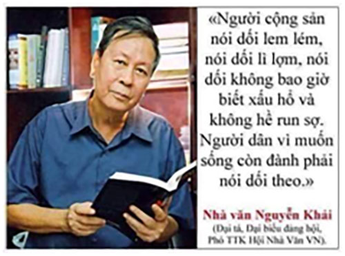 [Người dân vì muốn sống còn, đành phải nói dối theo, nghe sao mà tủi thân quá! Hình bên phải là tấm bia minh chứng cho nhận xét của ông Nguyễn Khải.] (Hình ảnh: Nhà văn Nguyễn Khải, lấy trên Google. Hai bức về mộ tập thể: NTT 1972.)