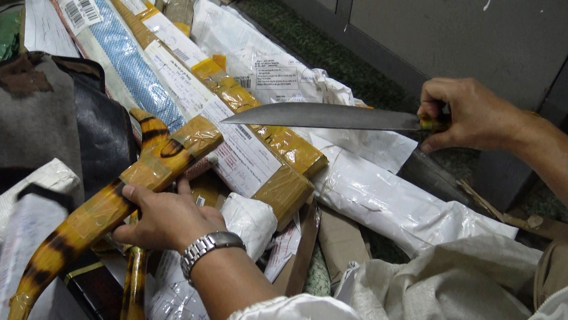 Qua công tác điều tra, chiều cùng ngày, công an phát hiện 1 lô hàng gồm 441 kiện hàng có dấu hiệu nghi vấn nên đã phối hợp với bưu điện quận Thủ Đức tiến hành kiểm tra. Qua kiểm tra, công an phát hiện bên trong các kiện hàng này chứa hơn 1.000 hung khí nguy hiểm các loại như: dao mèo, kiếm, dao găm, súng cao su, đao 3 khúc, kiếm nhật, súng bắn bi…