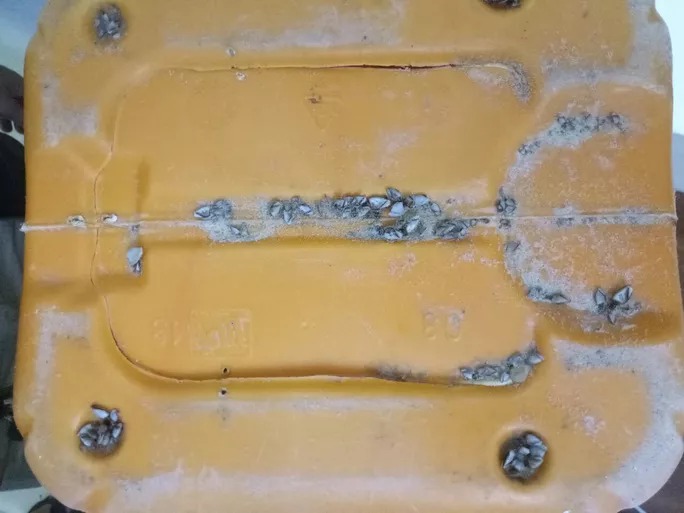 Nhiều con sò bám vào can nhựa, có khả năng can nhựa đã ở trên biển đã một thời gian