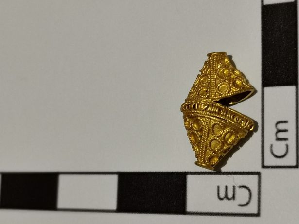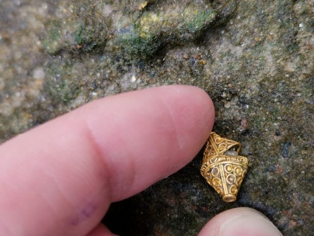 Miếng trang sức có kích thước chỉ 1cm, nằm ẩn sâu giữa những viên đá và sỏi. Các chuyên gia nói rằng miếng trang sức có niên đại hơn 1.000 năm trước thời Anglo Saxon.