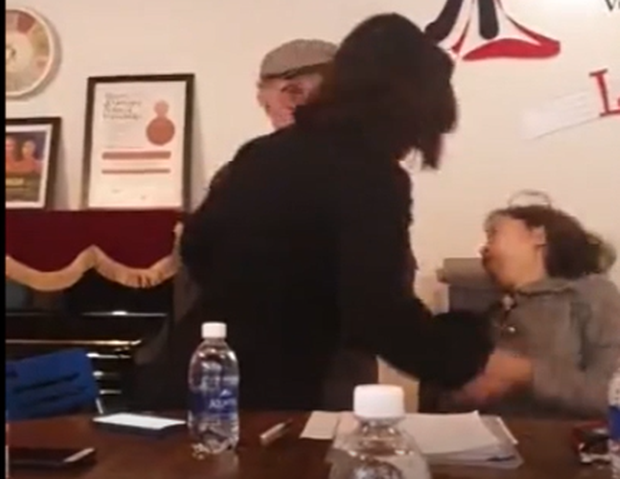 Nữ phụ huynh Thy tát thẳng vào mặt của cô giáo Hằng tại buổi làm việc giữa phụ huynh và trung tâm dạy nhạc. Ảnh cắt từ clip