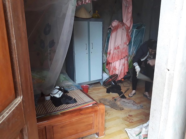 Chín khai lý do ra tay vì vợ đòi bỏ đi. (Trong ảnh: Người thân thu dọn nơi chị Hưởng bị Chín sát hại sau khi cơ quan điều tra hoàn tất khám nghiệm).