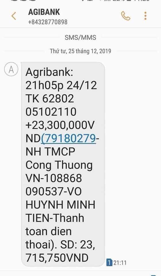 Sau khi chơi chiêu xong, hắn bắt đầu xin số tài khoản của chủ tiệm để chuyển khoản. 15 phút sau, chủ tiệm thấy có tin nhắn hiện lên AGIBANK đã nhận số tiền như trên và đúng với dư tài khoản.