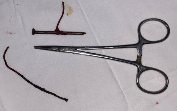Quá trình phẫu thuật diễn ra thuật lợi, dị vật là cây đinh dài 5cm kèm dây treo dài 15cm được lấy ra. Chiếc đinh được xác định xuyên thấu nhãn cầu và dính chặt vào đỉnh hốc mắt.