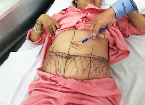 Ngày 5/1, sốt cao kèm đau đớn, bụng ngày càng sưng nhức, bầm tím, chảy dịch hôi, chị D. được người thân đưa lên khám tại BV Chợ Rẫy. Qua đánh giá lâm sàng và trên phim chụp, phó giáo sư - tiến sĩ - bác sĩ Đỗ Quang Hùng, Trưởng khoa Tạo hình - Thẩm mỹ BV Chợ Rẫy, nhận định bụng bệnh nhân có rất nhiều ổ áp xe. Bệnh nhân được cho dùng thuốc, kháng sinh để khống chế nhiễm trùng, chuẩn bị phẫu thuật mở rộng thành bụng nhằm nạo sạch mô bị hoại tử. Sau đó, bệnh nhân cần được tạo hình lại thành bụng, lấy bớt da thừa mới cải thiện bớt về thẩm mỹ vì biến chứng áp xe gây ra sẹo xấu, co rút bụng của chị.