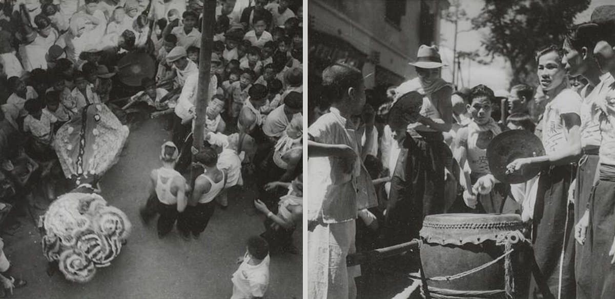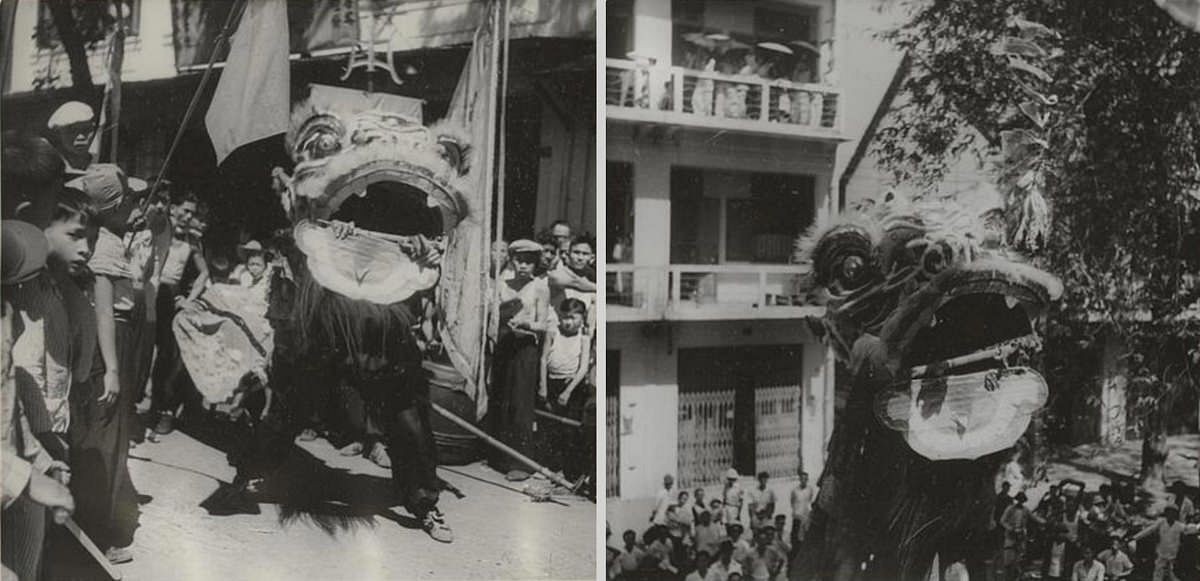 Buổi biểu diễn múa lân trên đường phố Sài Gòn ngày Tết thu hút đông khán giả. Ảnh chụp những năm 1940 - 1949