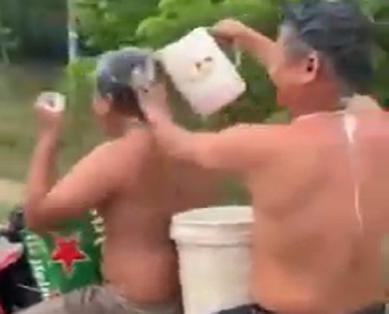 Trước đó, một đoạn clip gần 2 phút ghi nhận lại cảnh 2 thanh niên đi trên xe máy, không mặc áo, không đội mũ bảo hiểm. Sau đó, người ngồi sau dùng ca nhựa múc nước đổ lên người chở mình và bản thân để tắm. Trong quá trình này, cả 2 đùa giỡn bất chấp an toàn khi tham gia lưu thông.