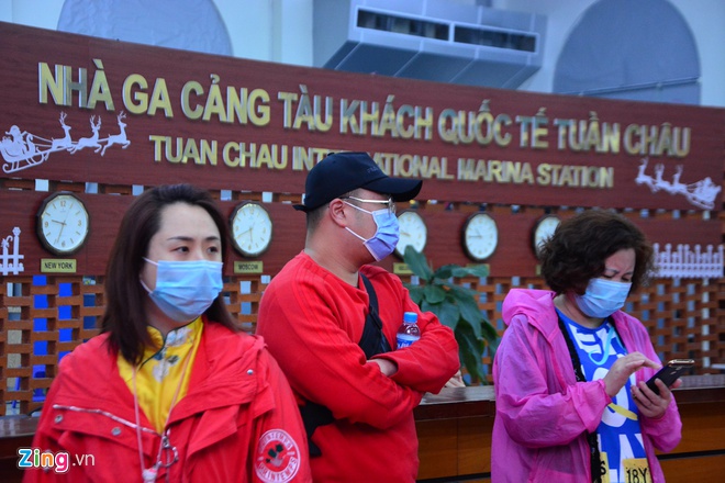 Khách du lịch Trung Quốc đeo khẩu trang đi tham quan vịnh Hạ Long trong sáng ngày mùng 1 Tết. Ảnh: Quốc Nam.