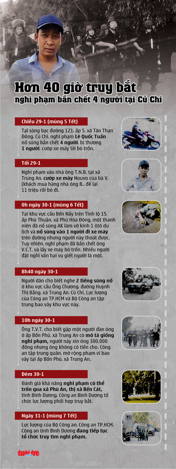 Từ ngày 30-1, hàng trăm cảnh sát bao vây khu vực ấp Bốn Phú, xã Trung An, huyện Củ Chi để truy tìm Lê Quốc Tuấn, nhưng sau 3 ngày liên tục tìm kiếm, lực lượng chức năng vẫn chưa bắt được nghi phạm.