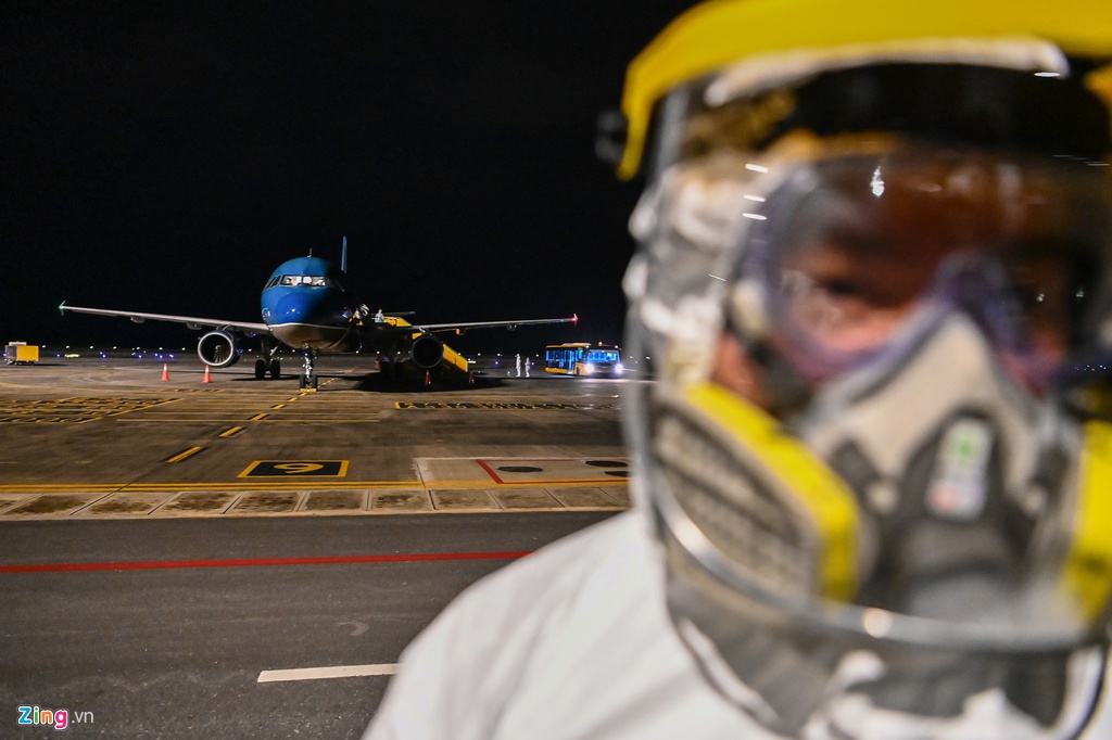 Trước khi lên xe buýt ra khỏi sân bay để về Hà Nội cách ly, họ thay bộ đồ bảo hộ khác, vẫn để trùm kín toàn thân, và được khử trùng lần nữa.