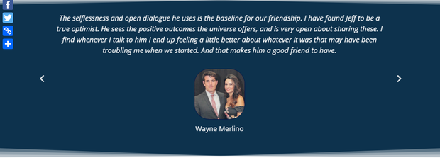 Nghĩ là làm, Jeff... lập hẳn 1 website để giới thiệu về bản thân và những thành tựu đã đạt được trong cuộc sống. Lướt qua webisite, chúng ta có thể sơ lược Jeff là một anh chàng năng động, tháo vát và rất yêu thể dục thể thao! Ngoài ra, anh chàng cũng được đánh giá là một người bạn tốt bụng và nhiệt tình, vì ở cuối webiste có hẳn... review về anh do chính tay những người bạn ngoài đời gõ phím đánh giá!