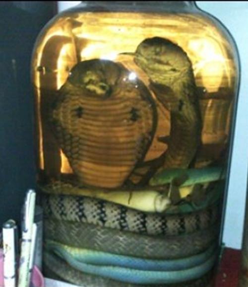 Nhìn vào hũ rượu rắn của chồng và nói "Xà tửu đây"