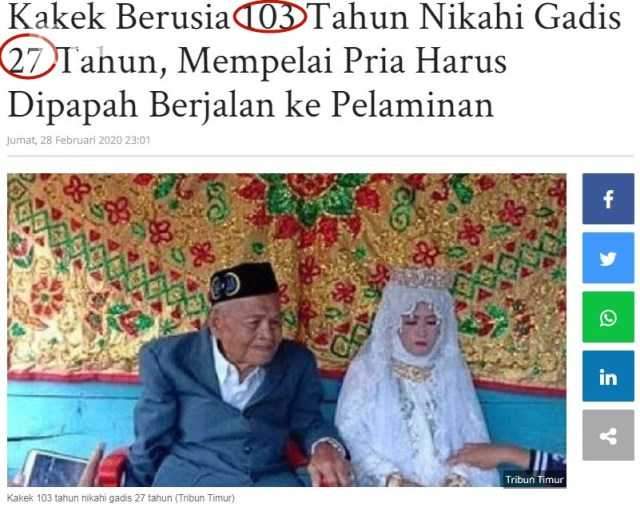 Câu chuyện có 1 không 2 này xảy ra tại Indonesia. Ông lão 103 tuổi đã cưới một cô vợ trẻ chỉ mới 27 tuổi. Đôi vợ chồng cũng đã giải thích lý do họ quyết định kết hôn.