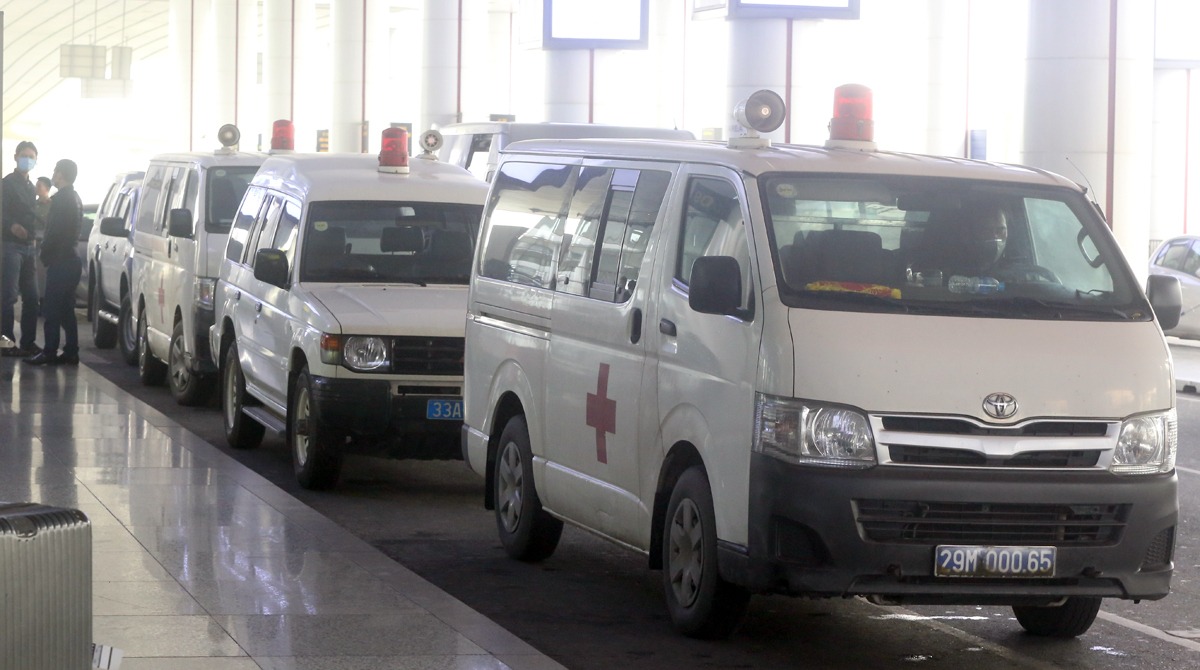 4 ôtô cứu thương được huy động túc trực ở tầng 1, nhà ga T2 để vận chuyển các mẫu bệnh phẩm của hành khách.