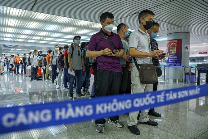 Hành khách nhập cảnh làm thủ tục kiểm dịch tại sân bay Tân Sơn Nhất. Ảnh: Hữu Khoa
