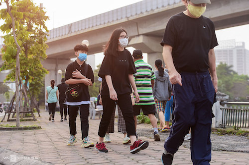 Trên phố Hoàng Cầu, đông người dân đi tập thể dục. Ai cũng đeo khẩu trang.