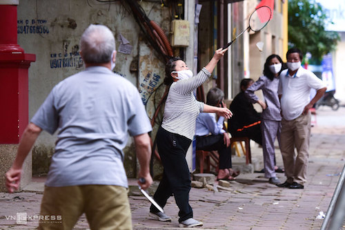 Người dân ra đường, chơi thể thao trên vỉa hè phố Quán Thánh.