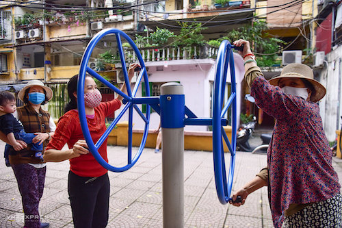 Cư dân tập thể dục ở khu vực sinh hoạt chung của khu tập thể Vĩnh Hồ, quận Đống Đa.