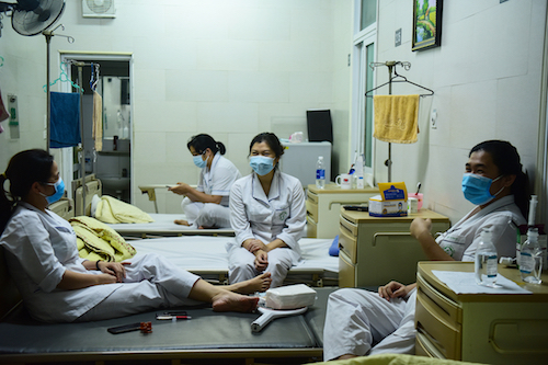 Các nhân viên Khoa C4, Viện Tim Mạch, ngồi trò chuyện tại phòng nghỉ ngơi, cùng chờ đến 0h. Khoa C4 hiện điều trị 14 bệnh nhân, 16 người nhà và 34 nhân viên y tế.