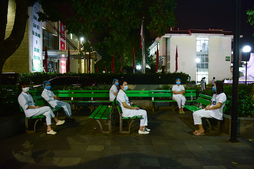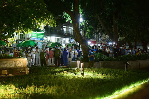 Ngoài sân, các y bác sĩ đeo khẩu trang, ngồi giãn cách nhau 2 mét, chờ đến 0h để chứng kiến khoảnh khắc dỡ hàng rào cách ly.