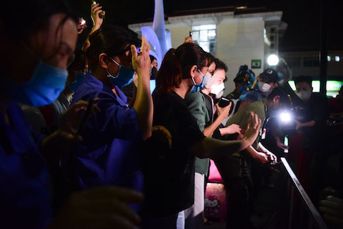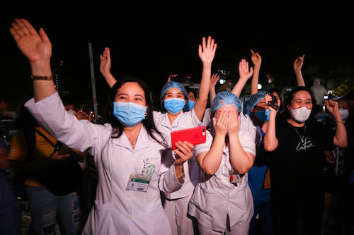 Bên trong bệnh viện, các y bác sĩ vỗ tay hoan hô, nhiều người xúc động, ùa ra chung vui, bảo nhau cùng bật đèn trên điện thoại và giơ cao, chứng kiến khoảnh khắc đặc biệt này.