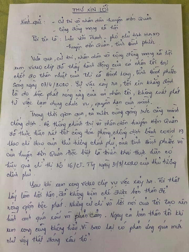 Liên quan đến vụ việc ông Lưu Văn Thanh, Phó chủ tịch HĐND huyện Hớn Quản, tỉnh Bình Phước có hành vi chống đối tại trạm kiểm dịch Covid-19 của thị xã Bình Long (giáp ranh thị xã Bình Long và huyện Hớn Quản), ngày 14/4, ông Thanh đã viết một bức thư tay xin lỗi đồng thời xin từ chức.