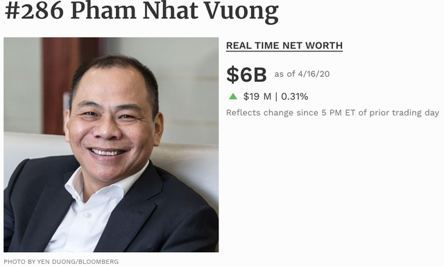 Theo thống kê của Forbes, tính đến ngày 16/4/2020, tổng giá trị tài sản ròng của ông Phạm Nhật Vượng đạt 6 tỷ USD.