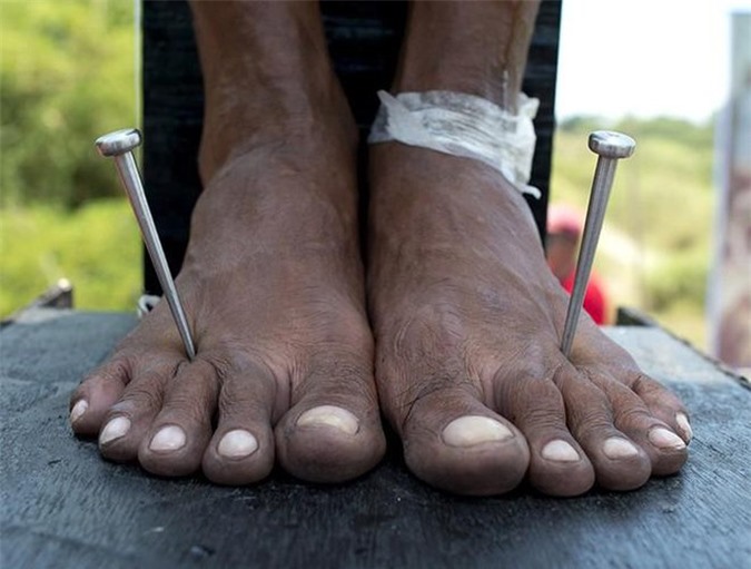 Các đinh sẽ được rửa sạch trước khi bị đóng vào người. Bốn giờ trước khi tiến hành lễ đóng đinh, đàn ông xếp thành hàng dài, chìa lưng cho roi tre và gậy bọc mảnh chai vỡ quần nát thịt da. Máu đỏ phun xuống mặt đường ướt đẫm. Người ta dùng những cây đinh dài chừng 12cm rồi đóng vào bàn tay những người tự nguyện, sau đó treo họ trên thánh giá chừng 10 phút. Những nghi lễ trên, vừa là nét văn hóa bản địa, vừa là hủ tục vẫn hiện diện ngay giữa thế giới phẳng hiện đại ngày nay.
