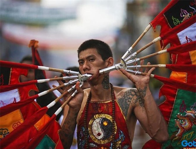 Phuket Vegetarian Festival, hay còn gọi là lễ hội ăn chay được tổ chức vào đầu tháng 10 hàng năm tại Thái Lan. Đây là thời điểm người dân xuống đường cầu nguyện và thực hiện một cuộc diễu hành khổ hạnh. Trong suốt 9 ngày diễn ra lễ hội, người tham gia phải thể hiện lòng sùng kính qua việc “bấm khuyên” bằng những vật dụng khủng khiếp và đáng sợ