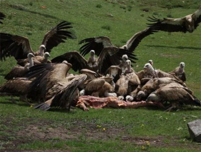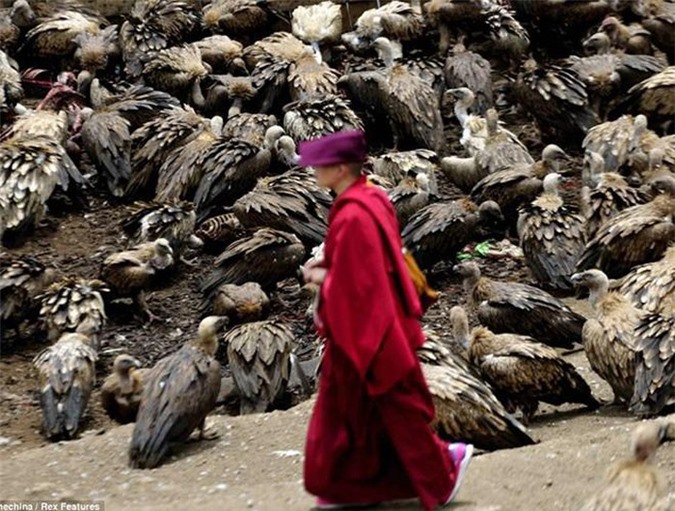 Theo đó, thi thể người chết sau khi qua đời sẽ được gia đình đưa lên đỉnh núi cao. Kế đến, người ta sẽ tiến hành róc thịt, đập vụn xương và cơ để bầy kền kền sà xuống ăn trong lúc những người thân của người đã mất ngồi lặng lẽ đọc kinh xung quanh.