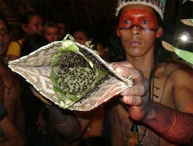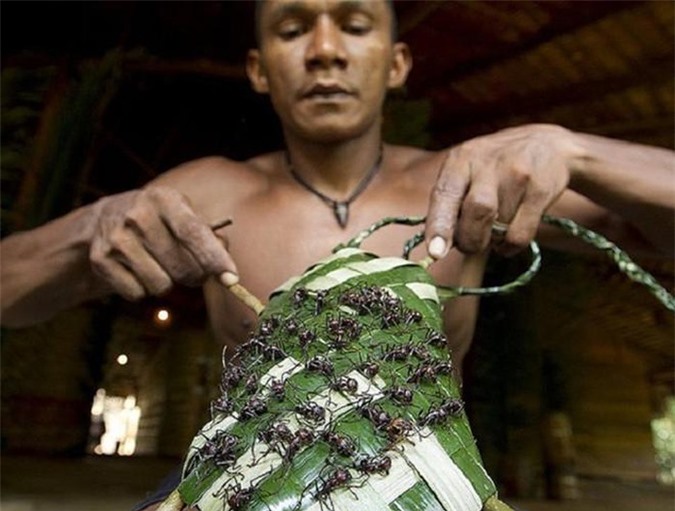 Kiến đầu đạn được coi là một trong những loài côn trùng có nọc độc gây đau đớn nhất thế giới. Đầu tiên, người ta sẽ bắt kiến đầu đạn và làm cho chúng mê đi, rồi dùng chúng và lá cây đan thành găng tay với phần đầu có nọc hướng vào bên trong. Các chàng trai Satere Mawe phải đeo hai găng tay đầy kiến trong vòng 10 phút