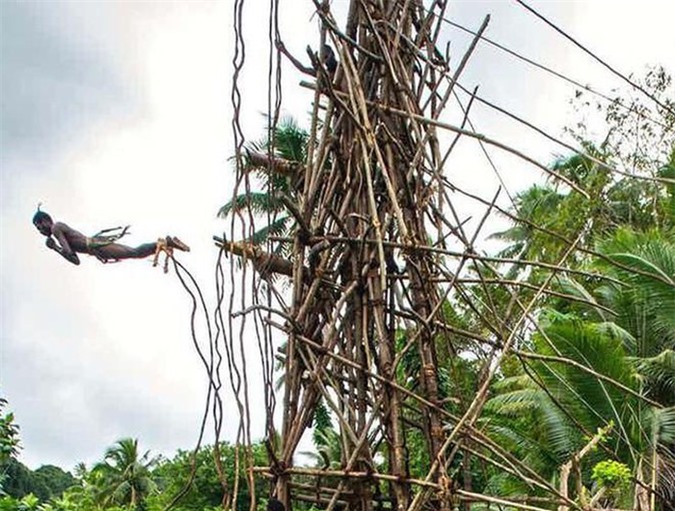 Ở Nam Thái Bình Dương, trên một khoảng đất trống, các thành viên trong bộ tộc Vanuatu dựng lên một tòa tháp có cấu trúc có độ cao 20 - 30m từ thân cây. Để được công nhận là những chiến binh dũng cảm thực thụ, những thanh niên, thậm chỉ cả các cậu bé 7-8 tuổi cũng phải tham gia nghi lễ điên rồ này. Mọi người sẽ nhảy từ tháp gỗ cao đó xuống mà chỉ được “bảo hiểm” bởi hai sợi dây buộc vào thân người