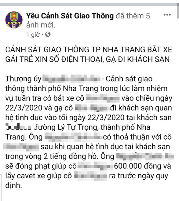 Trước đó, theo PLO, đầu giờ chiều 18/4, tài khoản Facebook “Yêu cảnh sát giao thông” đăng bài viết “Cảnh sát giao thông TP.Nha Trang bắt xe gái trẻ xin số điện thoại, gạ đi khách sạn”.