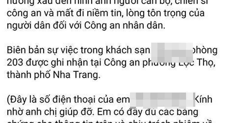 Bài viết ghi rõ ông A. đã quan hệ tình dục với cô KN tại phòng 203 của một khách sạn trên đường Lý Tự Trọng, TP.Nha Trang; sau đó đã trả giấy đăng ký xe, biên bản vi phạm ngay trong khách sạn. Bài viết còn cho rằng sự việc đã được ghi nhận tại Công an phường Lộc Thọ, TP.Nha Trang. Tài khoản Facebook nói ông A. đã có vợ và hai con.