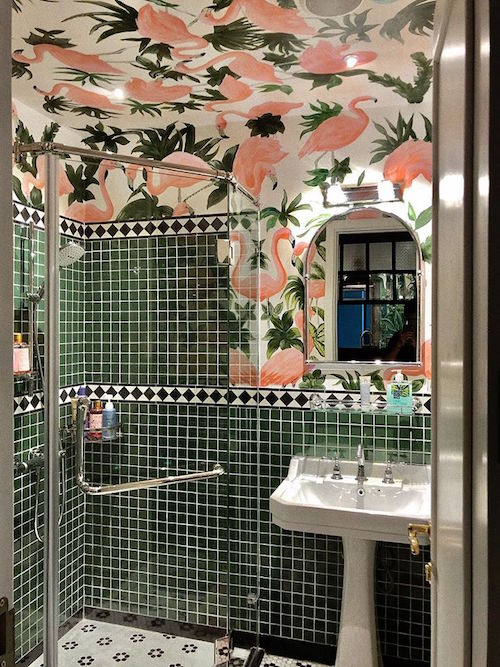 Những hình vẽ tay trên tường và trần phòng tắm kết hợp với gạch men nhiều màu tạo thành không gian rực rỡ.