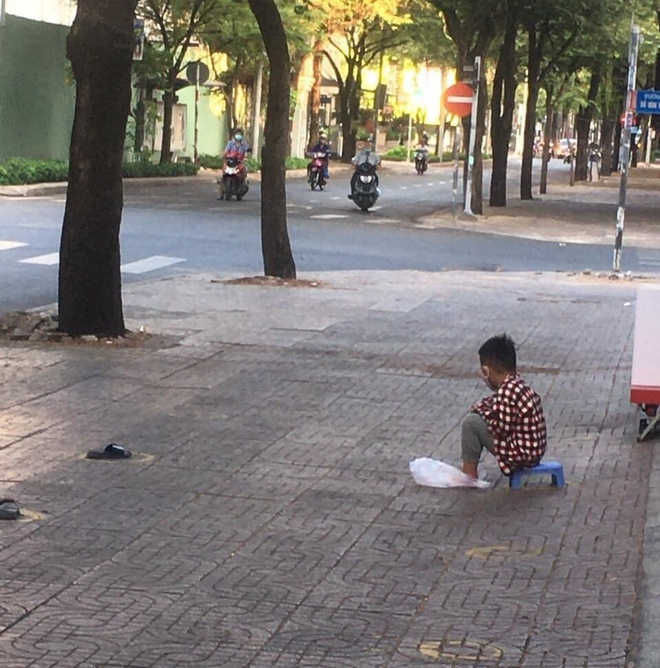 Khoảng 6h30, khi vừa tới nơi, anh thấy một bé trai khoảng 8-9 tuổi ngồi một mình bên ngoài. Cậu bé đi một mình và là người đầu tiên xếp hàng chờ lấy đồ từ thiện.