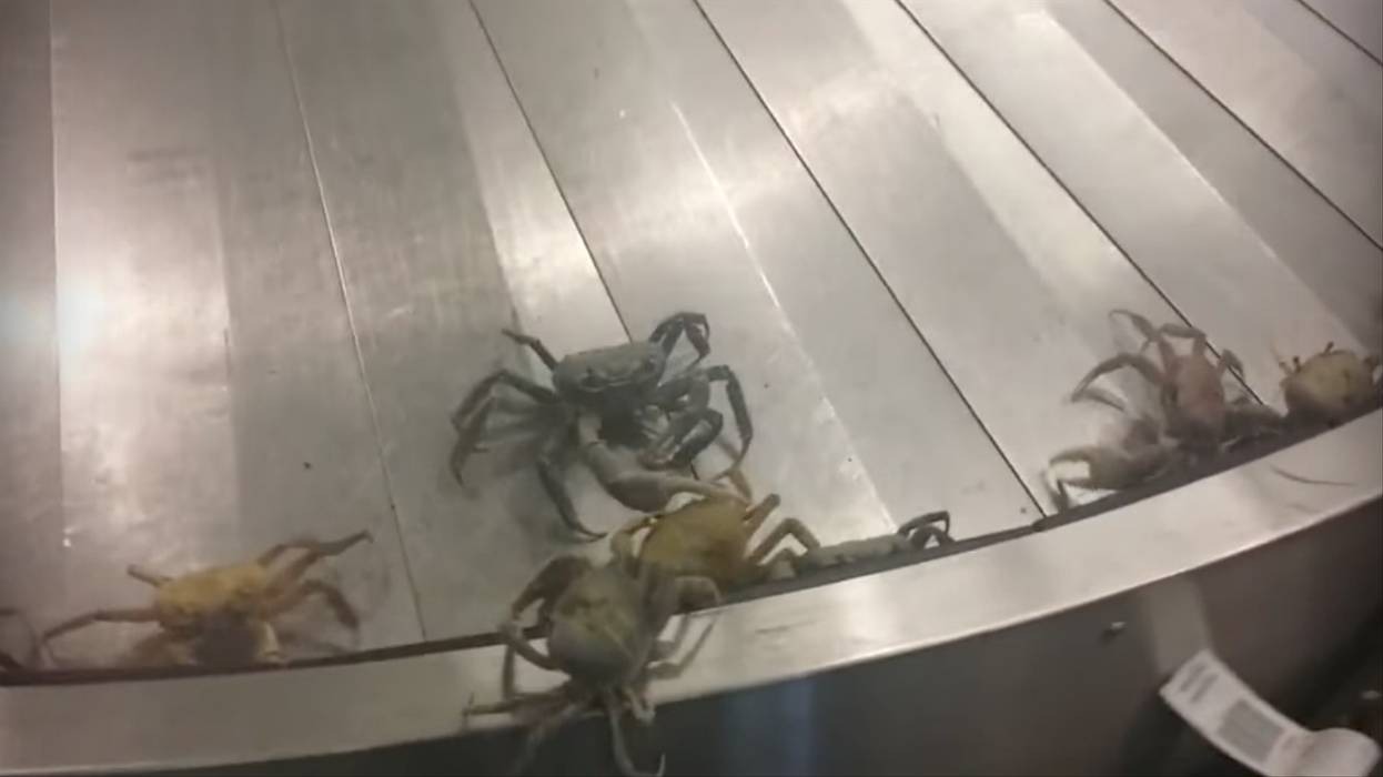 Vỡ thùng hành lý, cua ngạo nghễ đi dạo ở sân bay. Hàng chục con cua vô tư đi lại trên băng chuyền hành lý sau khi may mắn thoát khỏi thùng hành lý.