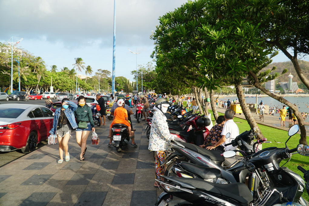 Đường Thùy Vân lúc 15h30, hàng trăm ôtô biển số TP HCM, Đồng Nai, Bình Dương đậu dọc hai bên đường, bên trong khuôn viên Trung tâm hỗ trợ khách du lịch và các đài quan sát cứu hộ. Các đường dẫn xuống Bãi Sau được dựng rào chắn, các biển thông báo "tạm dừng tắm biển", song hàng trăm người trèo rào xuống tắm, tập thể dục, đắp cát... Rất đông người không đeo khẩu trang.