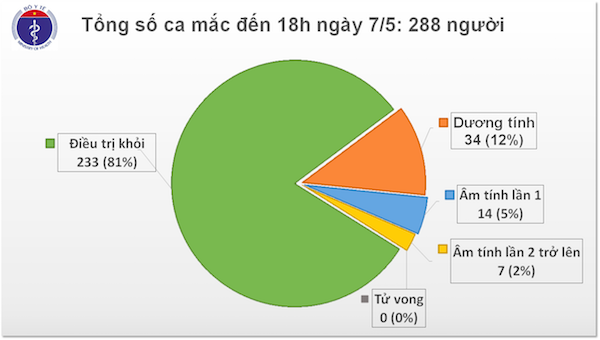 Tính đến ngày hôm nay 07/5/2020, Việt Nam có 288 bệnh nhân mắc COVID-19, trong đó 148 ca bệnh “xâm nhập” được cách ly ngay sau khi nhập cảnh; 140 ca do lây nhiễm trong cộng đồng. Kể từ ngày 16/4/2020 đến nay là 21 ngày, Việt Nam chưa phát hiện thêm ca bệnh nào do lây nhiễm trong cộng đồng.