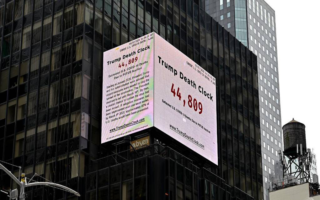 "Bảng tử thần Trump" do nhà làm phim Eugene Jarecki dựng trên mái một ṭa nhà ở Quảng trường Thời đại, vốn bị bỏ trống do Covid-19. Hôm 11/5, chiếc bảng hiển thị con số hơn 48.800 người đáng lẽ không phải chết trong tổng số hơn 80.000 ca tử vong ở Mỹ.