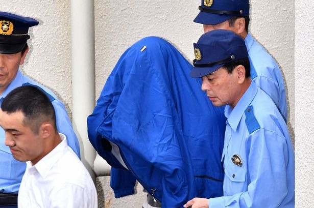 Nghi phạm Uematsu (trùm áo che mặt) được cảnh sát hộ tống sau khi đầu thú. Ảnh: Getty
