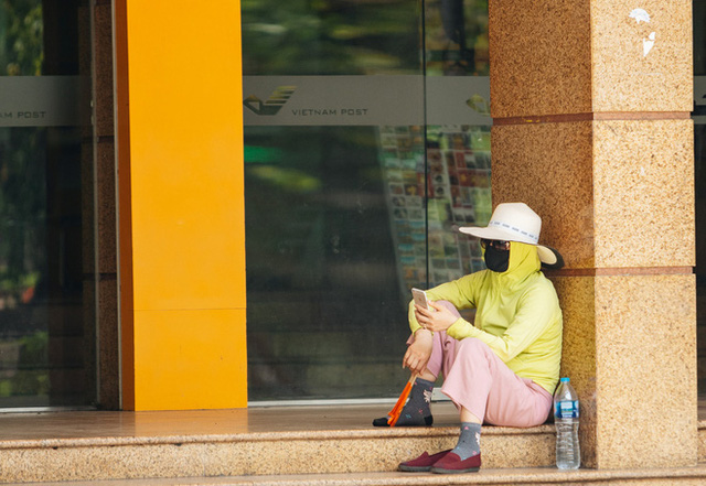 Những người lao động, xe ôm cũng tranh thủ ngồi nghỉ dưới bóng cây, không quên mang theo chiếc quạt giấy, cốc trà đá giải nhiệt... thậm chí là khi ngồi nghỉ vẫn khăn áo kín mít để tránh cái nắng nóng từ mặt đường phả lên.