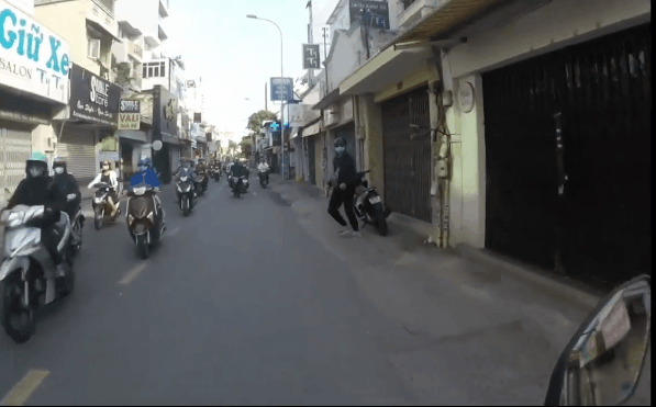 Tranh cãi không xong, người đàn ông vượt hẳn lên phía trước. Người này dừng xe bên lề đường, chờ thanh niên đi tới và đạp vào đầu xe máy. Người đàn ông lôi khóa xe định tấn công đối phương nhưng được người dân ngăn cản.