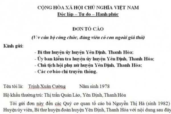 Trước đó, ông Trịnh Xuân Cường (42 tuổi), trú tại thị trấn Quán Lào (huyện Yên Định, Thanh Hóa) tố cáo vợ mình là bà Nguyễn Thị Hà (38 tuổi) - Huyện ủy viên, Bí thư Huyện đoàn huyện Yên Định với nội dung bà Hà vi phạm Luật hôn nhân và gia đình.