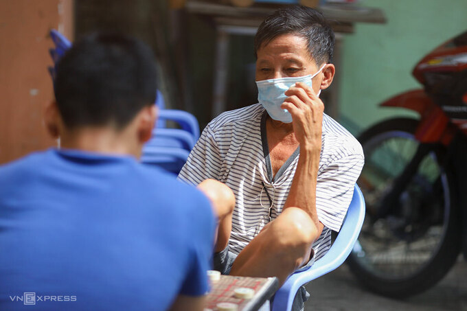 Người dân Đà Nẵng đeo khẩu trang khi chơi cờ trước cổng nhà, sáng 30/7. Ảnh: Nguyễn Đông.
