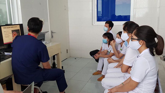 Các chuyên gia Trường Đại học Y Hà Nội tập huấn về quy trình lấy mẫu xét nghiệm nCoV cho nhân viên y tế Bệnh viện Đa khoa Trung ương Quảng Nam. Ảnh: Bệnh viện cung cấp.