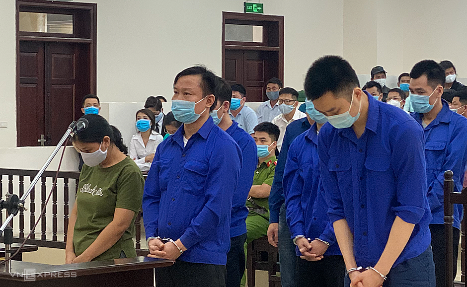 Lê Văn Quang (đứng giữa hàng đầu) và đồng phạm nghe tuyên án. Ảnh: Văn Bình