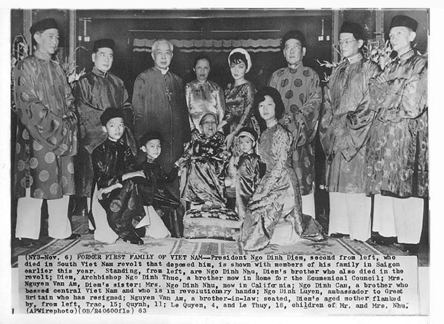 - Hàng ngồi: cụ bà mẹ ông Diệm, kèm hai bên là các con của ông bà Ngô Đình Nhu, từ trái qua gồm: Ngô Đình Trác 15 tuổi, Ngô Đình Quỳnh 11 tuổi, Ngô Đình Lệ Quyên 4 tuổi, và Ngô Đình Lệ Thủy 18 tuổi.