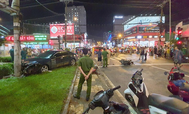 Đến giao lộ Ung Văn Khiêm - Xô Viết Nghệ Tĩnh (quận Bình Thạnh, TPHCM), ô tô bất ngờ lao về trước tông hàng loạt xe máy rồi lao lên tiểu cảnh, cắm đầu vào cột điện.